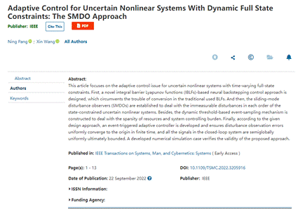 日前,公司2019级电子信息工程专业本科生庞凝以第一作者身份撰写的科研论文《Adaptive Control for Uncertain Nonlinear Systems With Dynamic Full State Constraints: The SMDO Approach》在计算机、控制领域顶级期刊《IEEE Transactions on Systems, Man and Cybernetics: Systems》在线发表。指导老师王欣副教授为该论文的通信作者。