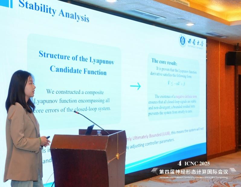 李子涵同学在王欣教授的指导下,向大会提交高质量论文《Neural-network-based Self-triggered Observed Platoon Control for Autonomous Vehicles》并完成全英文学术汇报,以扎实的科研功底、清晰的逻辑表达与出色的应变能力,赢得参会专家的高度认可。