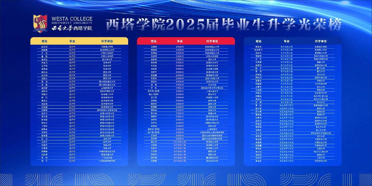 此外,生物技术2班、生物技术1班、经济1班成为本届升学TOP 3班级,11个优秀寝室实现寝室成员全体升学:竹园一区D栋621、竹园一区D栋517、竹园一区D栋607竹园二区1舍304、竹园二区1舍142、竹园二区1舍132竹园二区1舍120、竹园二区1舍117、竹园二区1舍113、竹园二区1舍110。