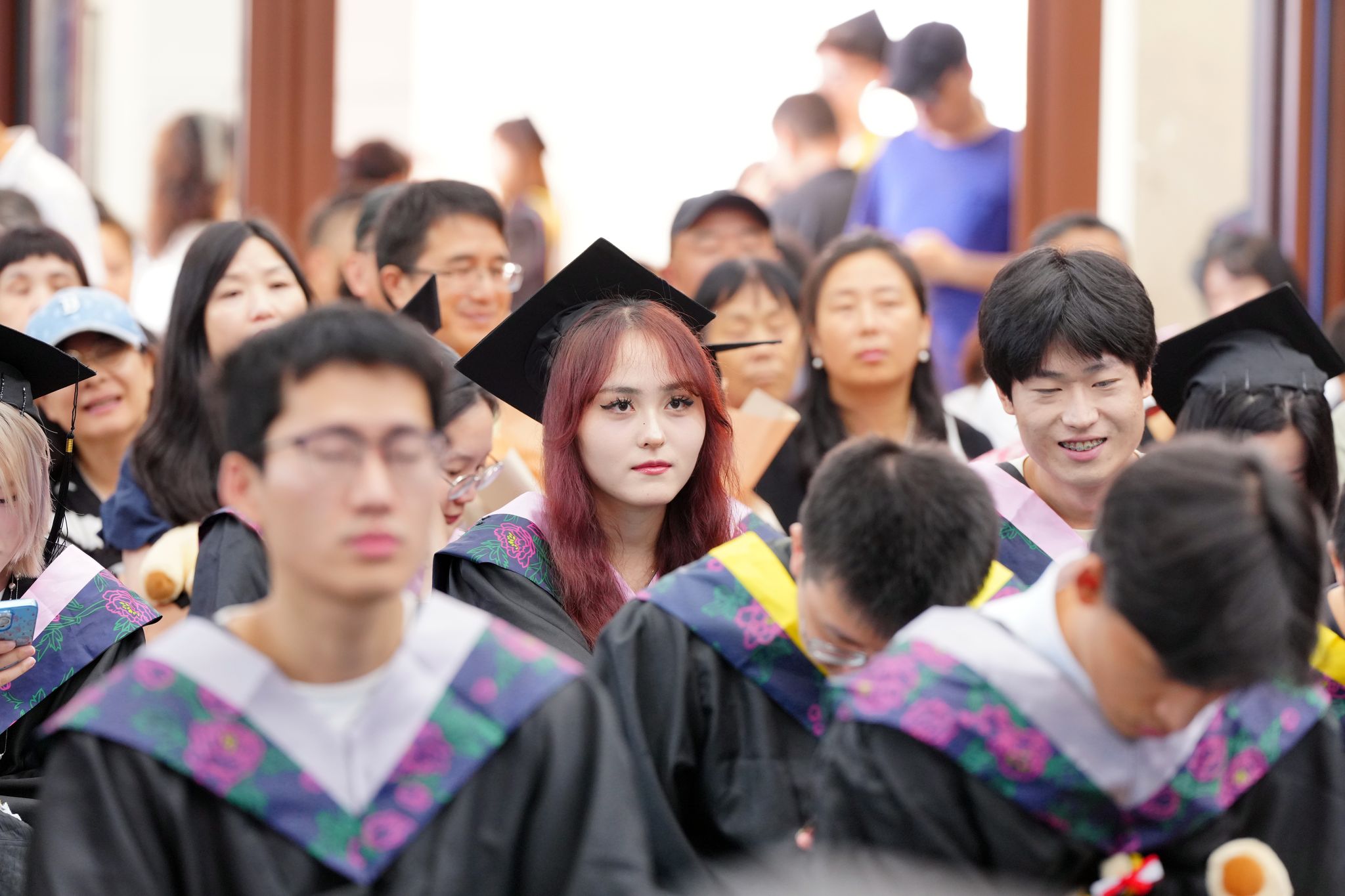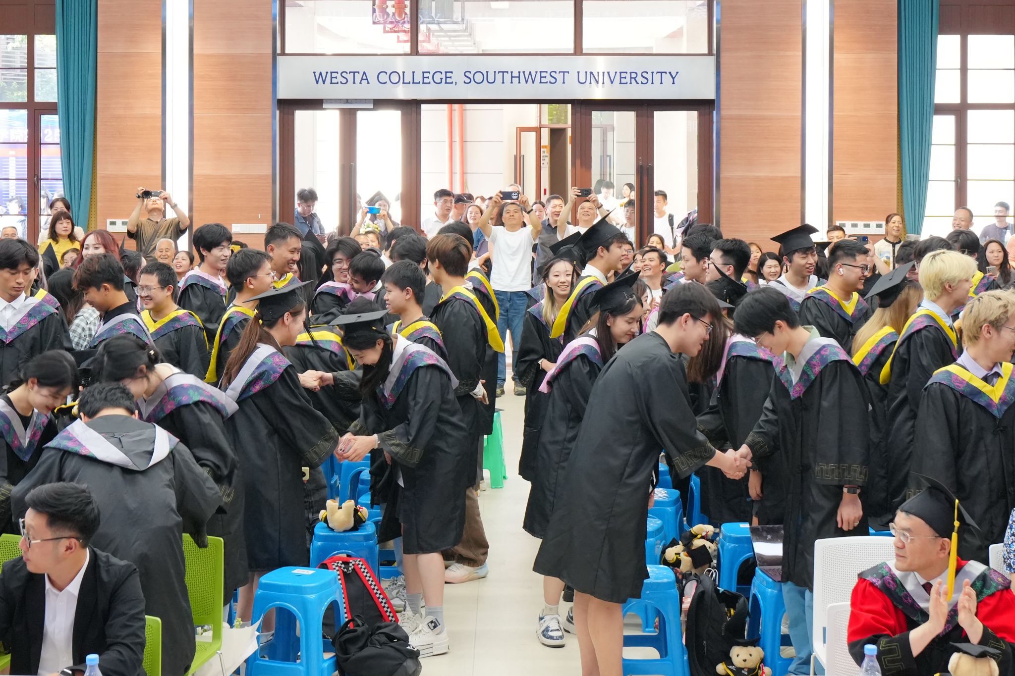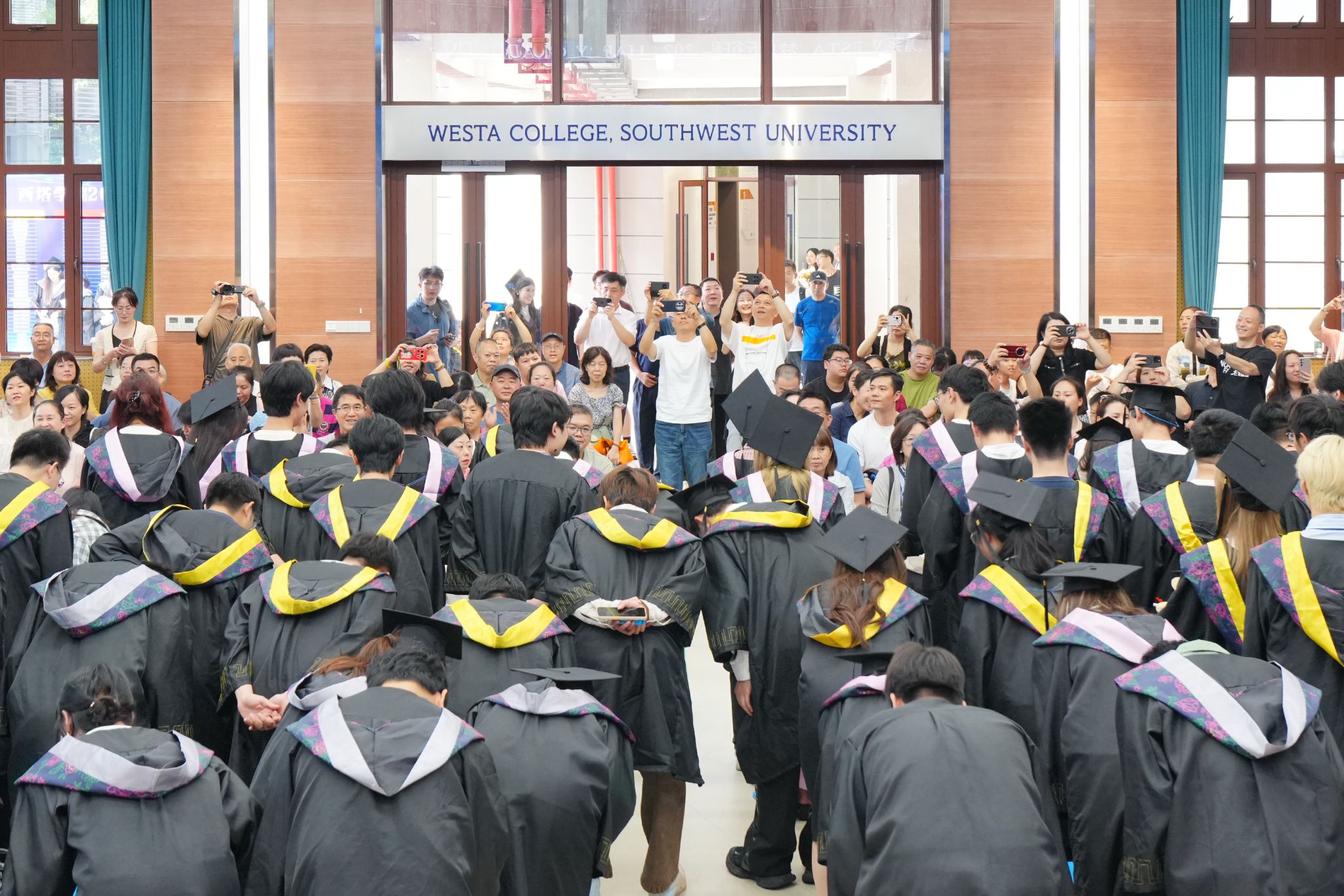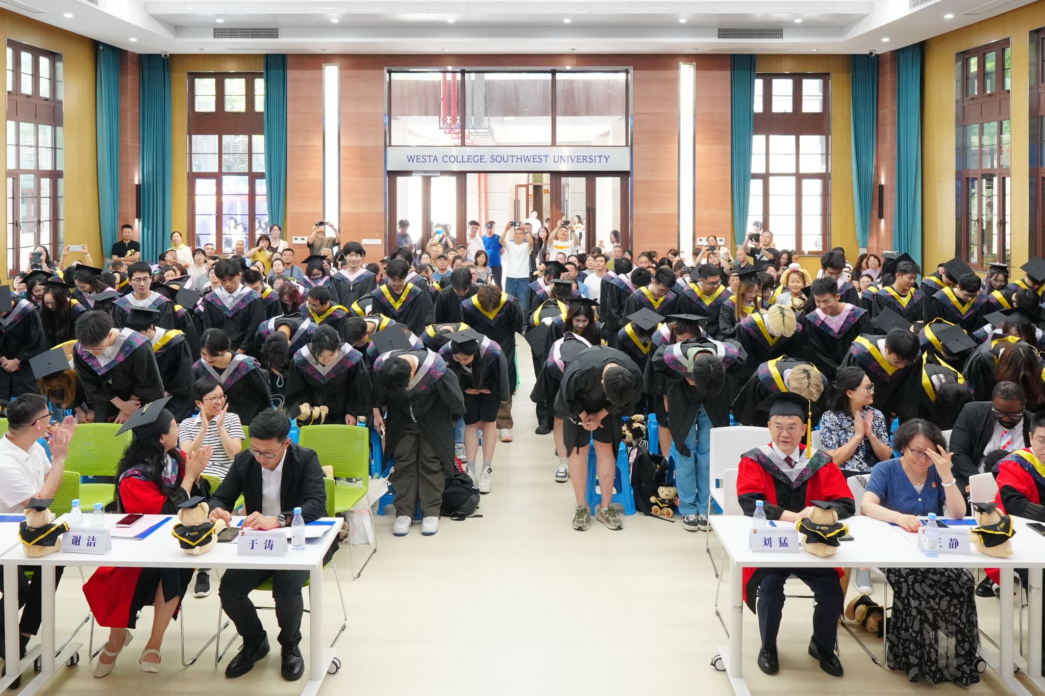“请全体毕业生起立,向养育你们的父母、培育你们的老师深鞠一躬!向身边的同窗一个握手或者拥抱,感谢四年的陪伴!”随着主持人的提议,全体毕业生们转身面向父母、师长深深鞠躬。台下掌声与哽咽交织,汇成最动人的交响。