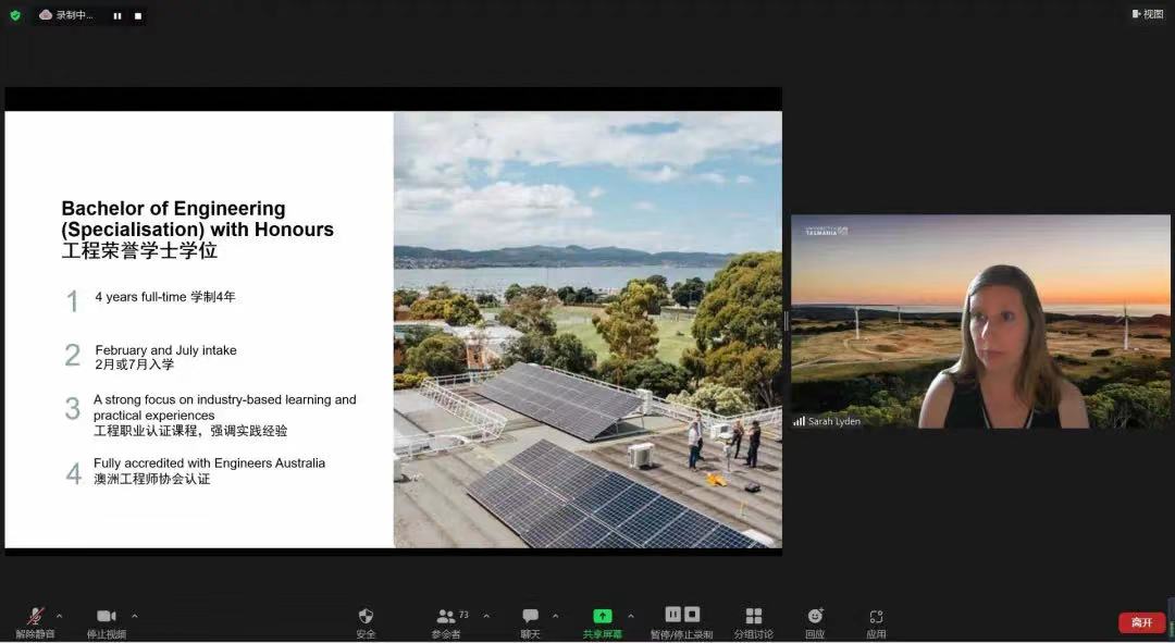 Tim Finnigan经理代表塔斯马尼亚大学工程公司对2022级新生表示欢迎,他分享了塔斯马尼亚大学及工程公司概况,就本专业科研实力、就业前景、校园环境、霍巴特环境等进行介绍;Terry Bailey执行经理就课程信息、专业前沿信息、团队情况进行分享;Sarah Lyden博士鼓励西塔员工积极与外方教师交流,重视英语学习,打牢专业基础。会上,塔斯马尼亚大学相关负责人通过视频、图片素材等为员工们展示美丽的校园环境与先进的实验室环境。已赴塔大学习的西塔学长们热情地分享个人在当地学习生活的经历,并寄语新生。