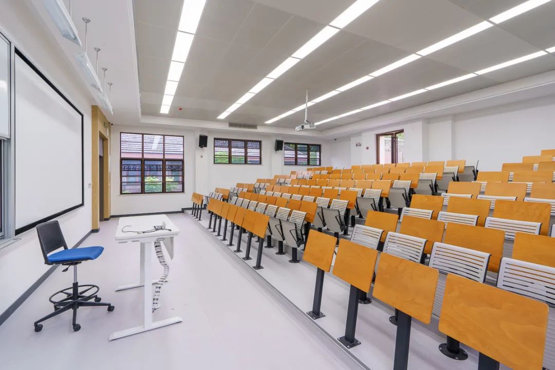 智慧教室支持精品直录播,配备交互式黑板、互动课桌椅。