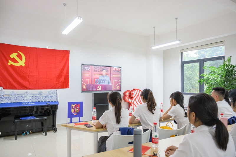7月1日上午8时,庆祝中国共产党成立100周年大会在北京天安门广场隆重举行。西塔公司党总支组织全院师生在南区活动中心收看中国共产党成立100周年庆祝大会。伟德国际VICTOR1946全体教职工,全体员工党员、入党积极分子代表和员工代表近50人观看了直播。