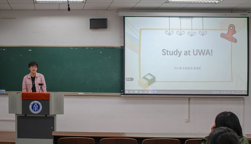 2017级生物技术专业员工大使陈思彤从海外学习的课程类型、双学位选择、授课方式等方面进行介绍,她强调海外学习期间良好的自我管理能力的培养是收获美好未来的必要前提,同学们应当加强自我学习的管理以更好适应海外学习。