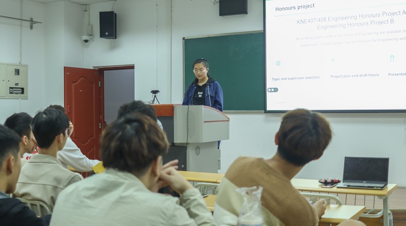 2017级电子信息工程专业员工大使汤仁君从塔斯马尼亚大学食品专业学习模式、课程介绍、海外生活和远程授课体验四个方面出发,结合自身经历为同学们的规划提出了许多意见。她表示,塔斯马尼亚大学的选课机制灵活,其先进的实验室设备及多样的课堂模式能帮助同学们在充实的学习生活中不断丰富自我、提升能力。