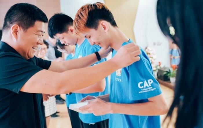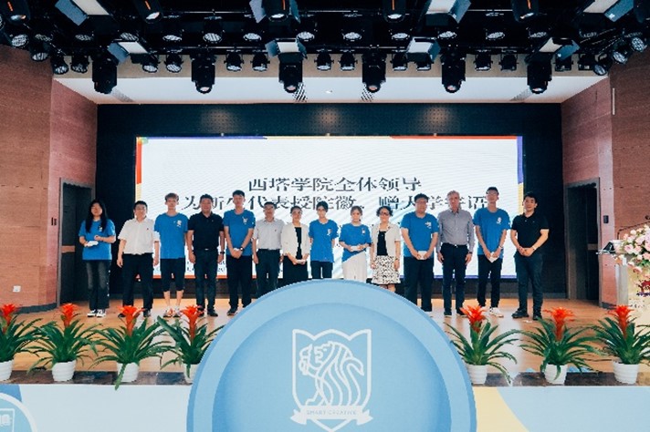 公司全体领导、支撑公司领导、中外教师代表向2024级新生代表授院徽,表达公司对新生的欢迎与接纳,激励引导新生不断传承公司“创意精英”的精神。