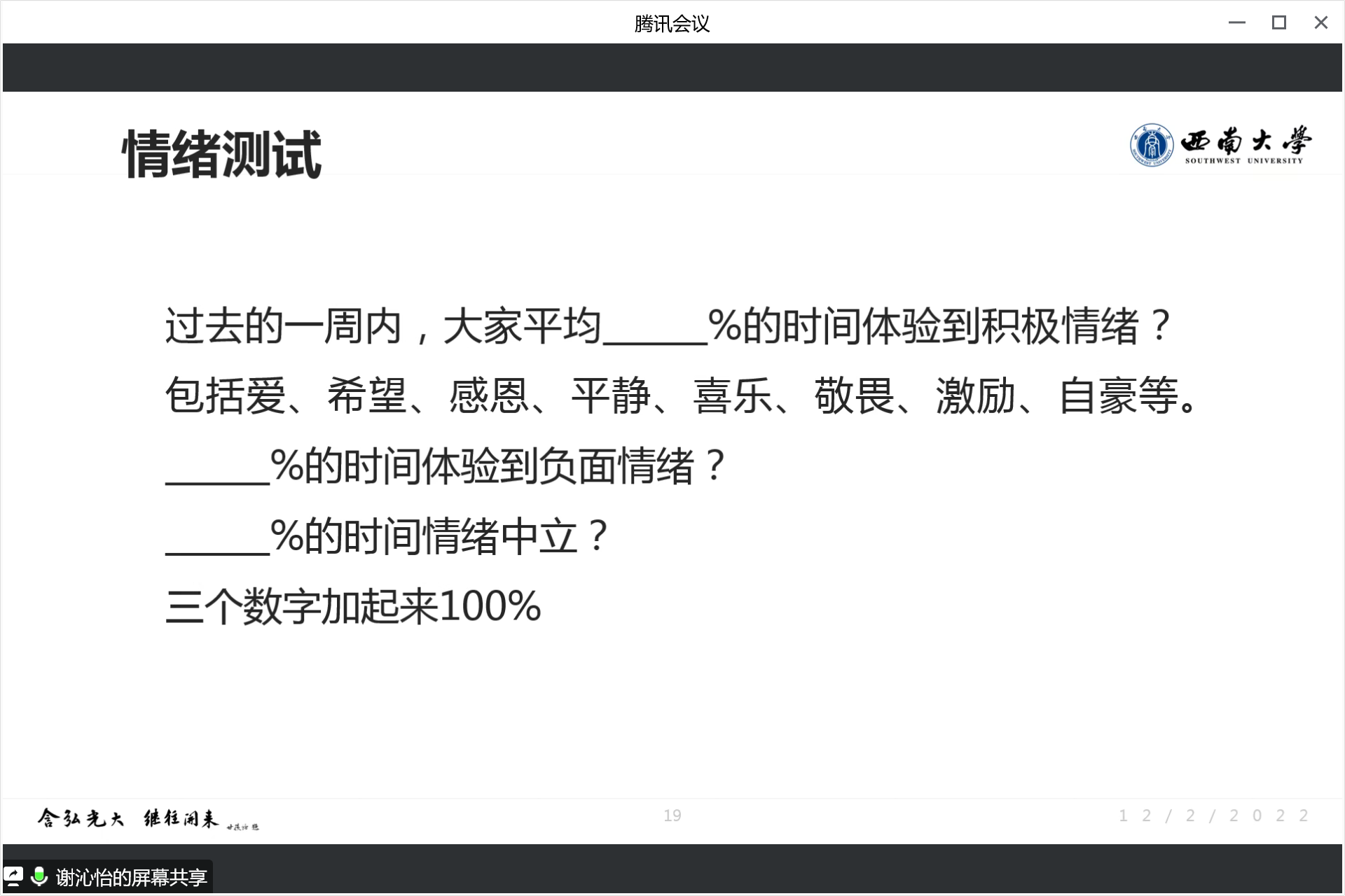 谢老师提到,积极心理学比传统心理学内涵更丰富,积极心理学可以通过发现优势和美德来让人们感受到真正的幸福。她引经据典,给学员们讲授了什么是“情绪”,并通过一个情绪测试让大家更好地理解与控制自身情绪。