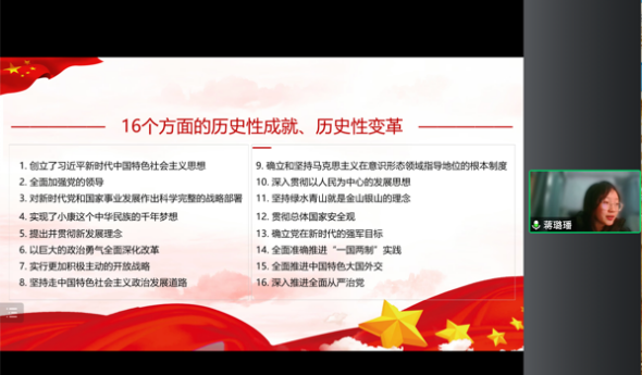 宣讲活动以“序曲”、“篇章”、“结语”三部分展开,每个版块既相对独立,又有机统一。“序曲”部分以“回顾彪炳史册新成就”为主题,带领师生回顾了新时代十年的伟大变革和辉煌成就。“篇章”部分以“擎画百年大计新蓝图”为主题,向大家展示了国家实现民族复兴新篇章的大政方针及其让中国特色社会主义展现出的强大生命力。“结语”部分以“迈向伟大复兴新征程”为主题,宣讲团成员用坚定的口号“Unity is strength ,and only in unity can we succeed”来续写华丽篇章,以顽强的信念“A nation will prosper only when its young people thrive”来展现青春担当。