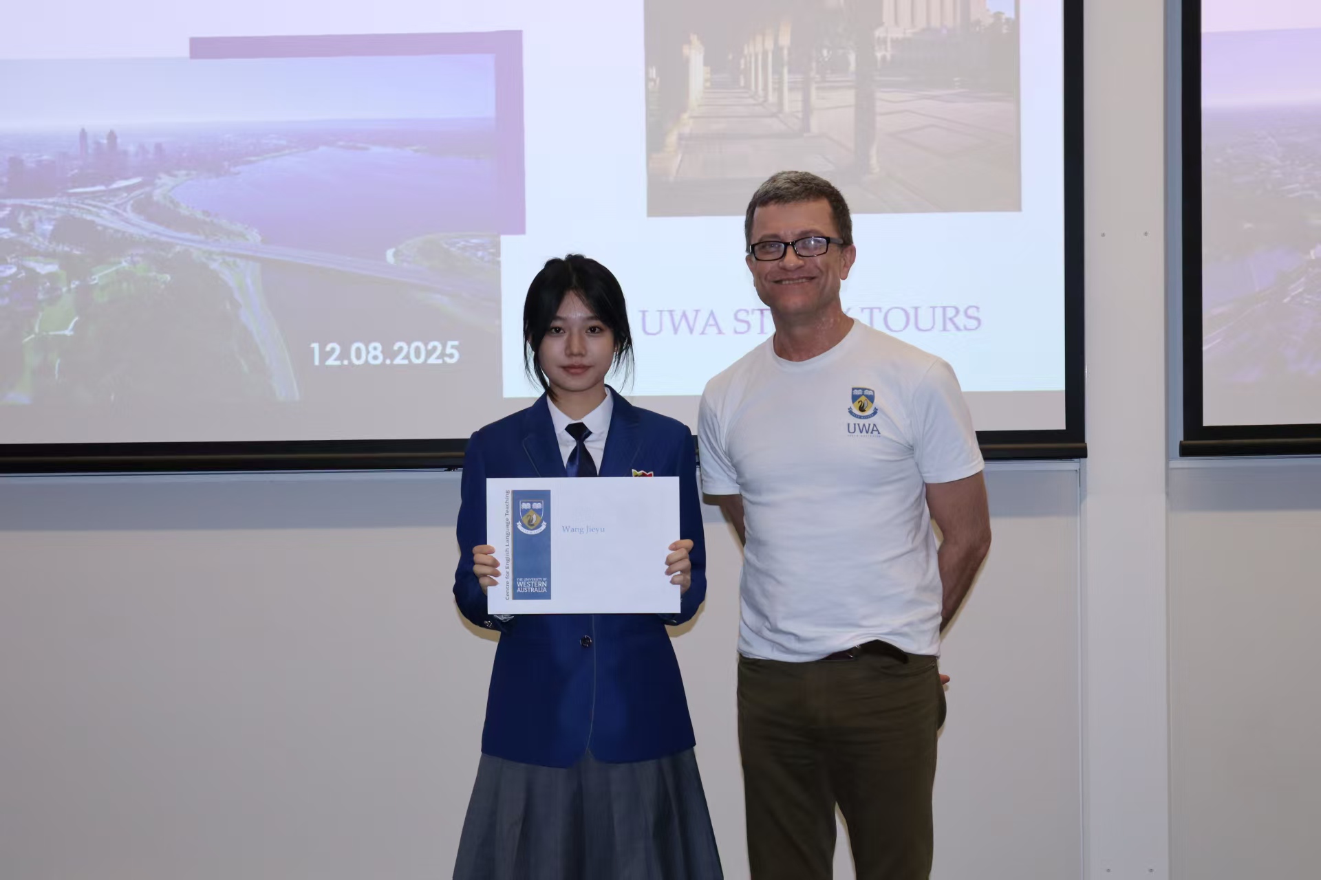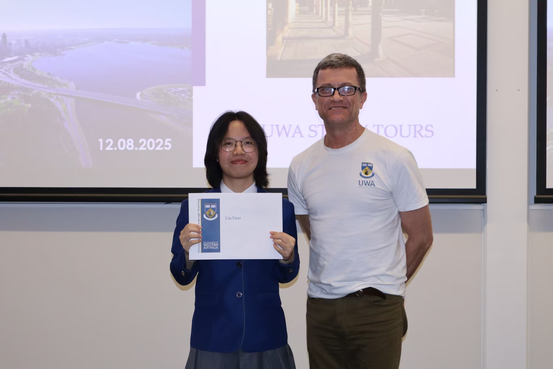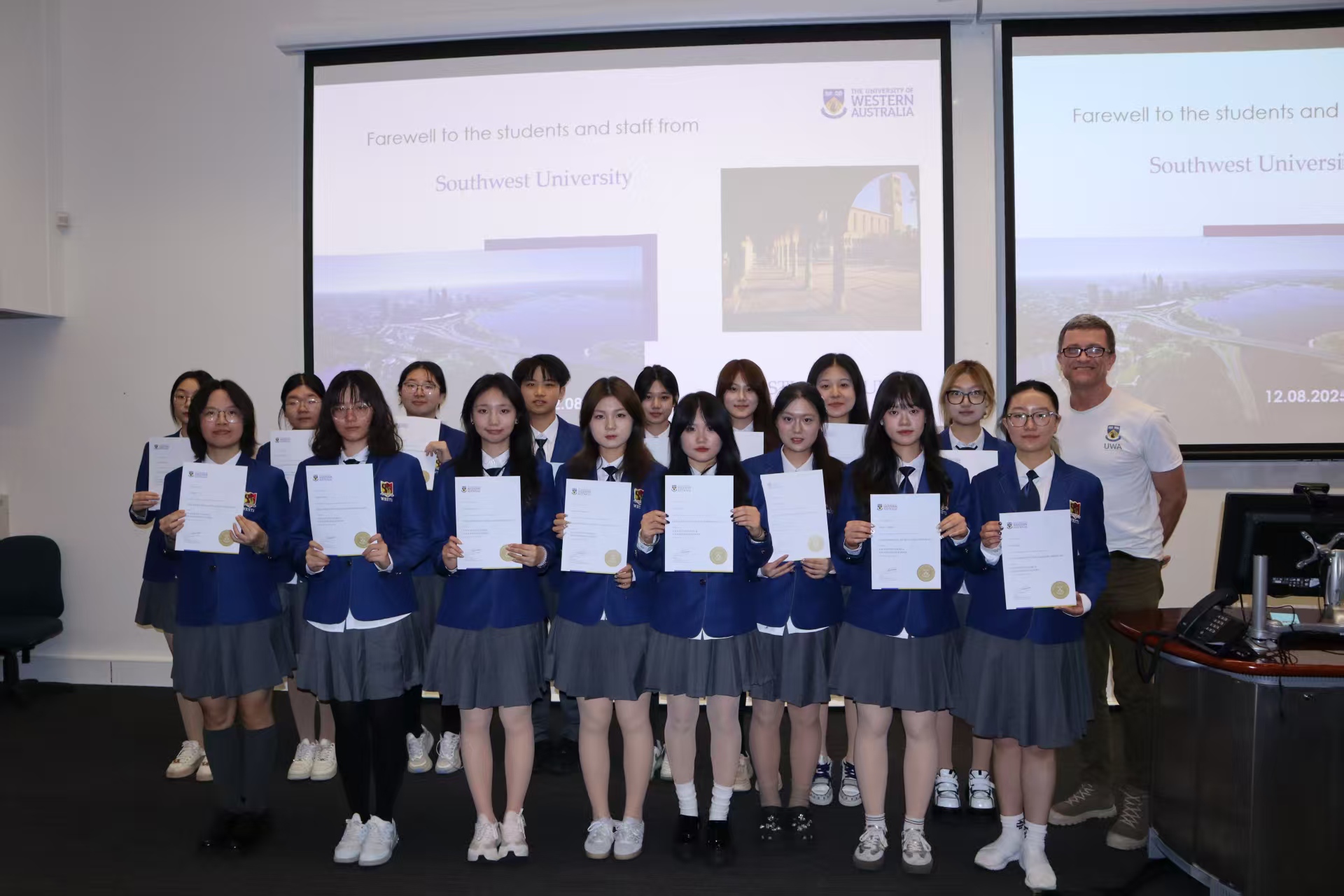 随后,电子信息工程专业员工代表廖睿涵与经济学专业员工代表施展上台分享,他们热情讲述了在西澳大学的学习探索与自我突破的经历。最后,同学们依次上台领取结业证书,并合影留念。