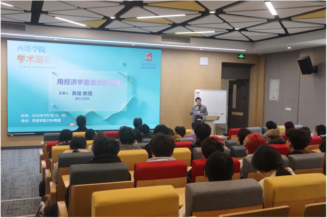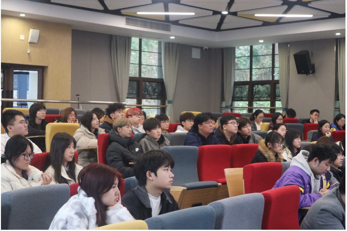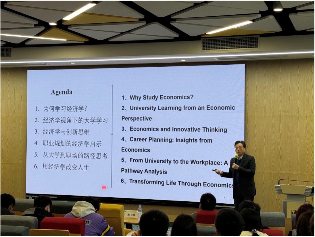 黄俊教授以"用经济学改变人生"为主线展开讲座内容。他结合公司中外合作办学特色,采用双语授课方式,借助苹果公司市场战略、美的集团转型实践等企业案例,深入浅出地阐释了数字经济对经济学研究方法的创新性变革。随后,基于自身丰富的学术研究与行业实践经验,黄教授从大学学习方法的优化策略逐步延伸至职业发展路径的规划指导,重点剖析了三个关键方面:大数据分析在经济学领域的实际应用场景、创新思维的培养路径与方法,以及职业规划与技能积累对于个人长远发展的重要意义。