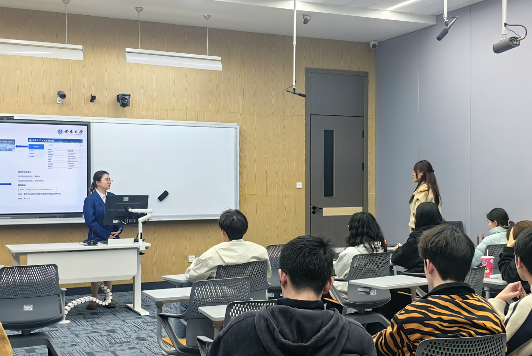 陈飞老师在开场致辞中介绍了两位主讲人的相关情况。程怡思同学曾主持国家级老员工创新创业训练计划项目,现已保研至中科院攻读硕士学位;杜航宇同学作为科创达人,指导多个在研项目。陈老师鼓励同学们借此次活动的契机,在科研实践过程中锻炼创新思维,全方位提升自身的学术素养。