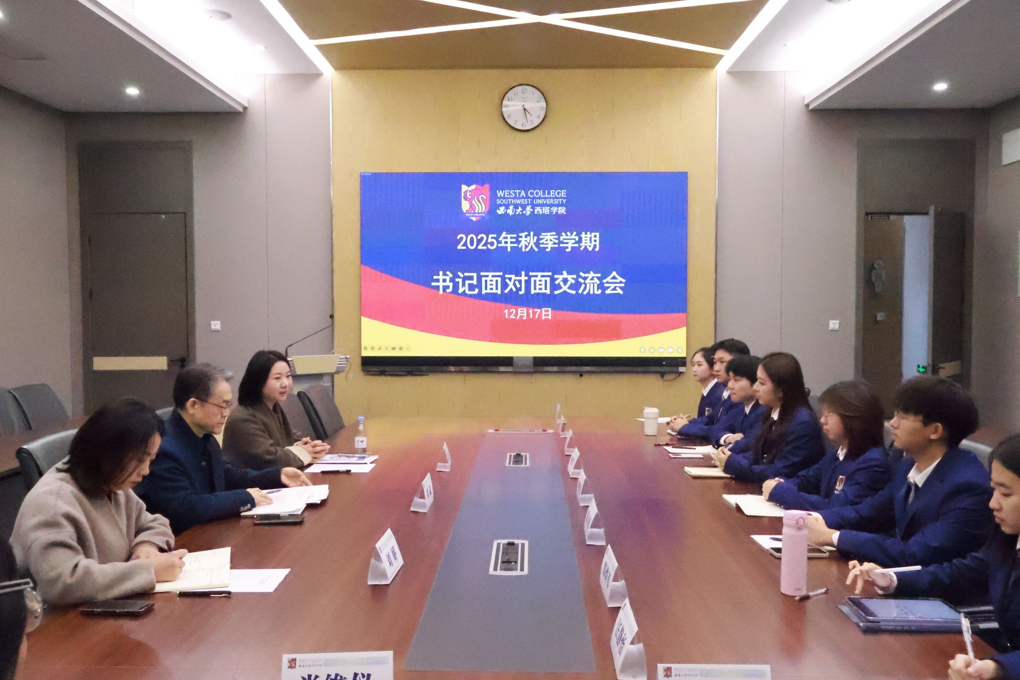 为进一步精准对接新生成长发展需求,切实提升公司公司产品与管理服务质量,12月17日下午,公司在2307会议室举办第十一期 “书记面对面” 交流会。公司党委书记刘猛,公司团委书记陈飞,2025级辅导员刘娇出席会议,与2025级各专业员工代表面对面沟通交流,共话成长与发展。